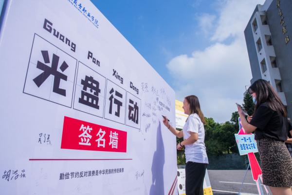 2020年9月7日,重庆商务职业学院学生食堂,大学生们在光盘行动签名墙上签字