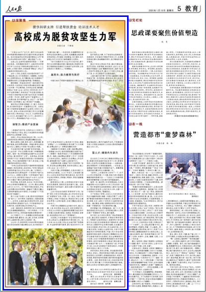 高校师生们积极发挥着人才、智力、科技优势,成为脱贫攻坚中一支重要的生力军。目前全国75所教育部直属高校已全部投入扶贫工作。2018年,首批44所综合类和理工科为主的直属高校共投入帮扶资金1.38亿元,引进帮扶资金13.18亿元,培训基层干部2.34万人,培训技术人员3.73万人,帮助销售农产品3.27亿元。