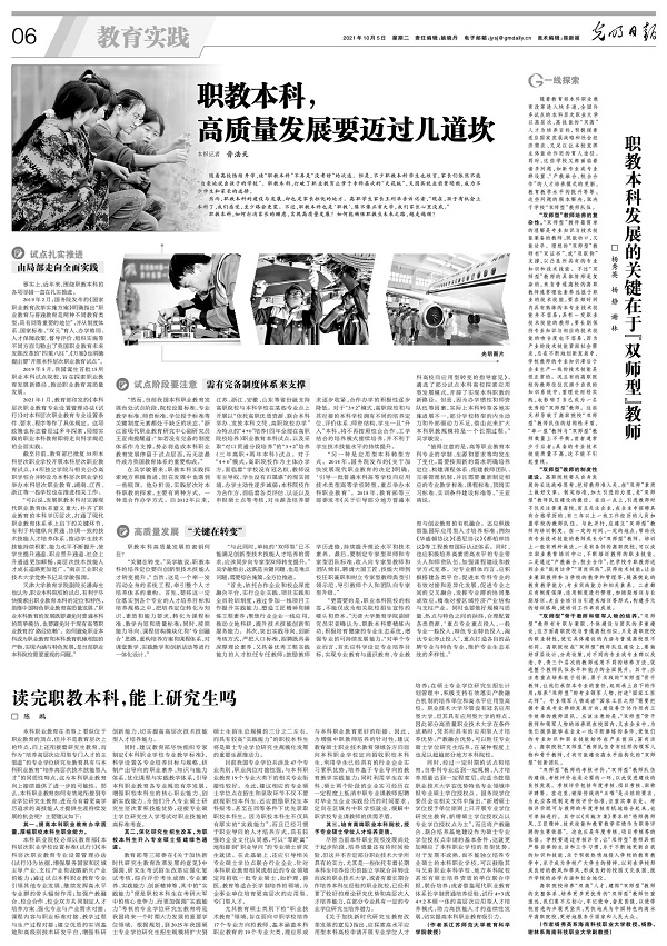 “然而,当前我国本科职业教育发展尚处试点阶段,院校设置标准、专业教学标准、师资标准、学位授予标准等关键制度元素都处于缺乏的状态。”浙江省现代职业教育研究中心副研究员王亚南提醒道:“如若没有完备的制度体系作为支撑,势必将造成本科职业教育发展停留于试点层面,而无法最终成为我国教育体系的重要构成。”