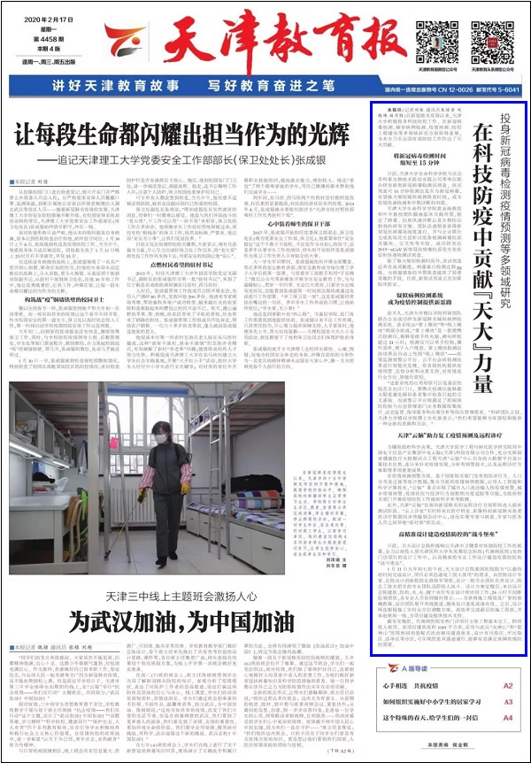 本报讯(记者刘佳 通讯员焦德芳 刘晓艳 赵习钧)自新冠肺炎疫情以来,天津大学积极投身科技防控工作,在新冠病毒检测、疑似病例检测、疫情预测、防控工程建设等多领域研究方面取得进展,为本市乃至全国疫情防控工作作出了天大贡献。