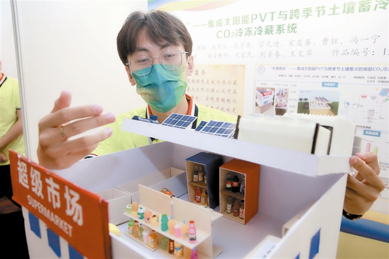 上图 获奖作品“天造地设”——集成太阳能PVT与跨季节土壤蓄冷的商超冷冻冷藏系统展示。 本报记者 张立摄