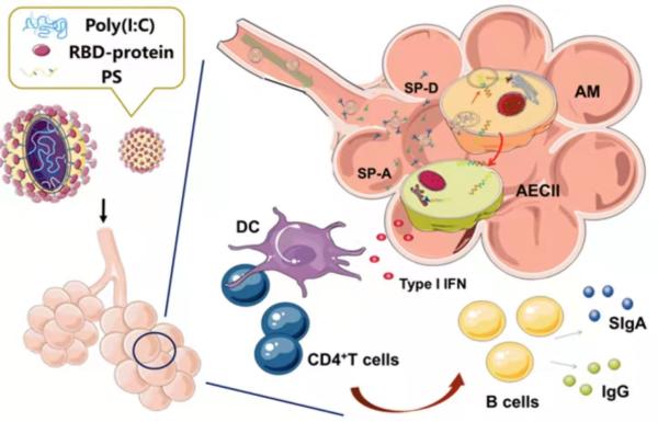 新冠病毒主要通过呼吸道进行传播。呼吸道粘膜是防止呼吸道病毒入侵的第一道屏障,激活粘膜免疫以保护机体免受病毒感染至关重要。天津大学研发团队通过构建仿病毒纳米颗粒开发了一种新型纳米喷雾技术,该仿病毒颗粒包含的“衣壳”由可高效结合肺巨噬细胞的表面活性脂质体组成,解决了常规呼吸道接种时疫苗难以进入机体的缺陷,仿病毒颗粒的“核心”为免疫佐剂,“刺突”蛋白为RBD,这一结构完全模拟了新冠病毒的尺寸、结构和感染方式,可更加高效的激活机体的呼吸道粘膜免疫,以获得更好的抗新冠病毒感染效果。