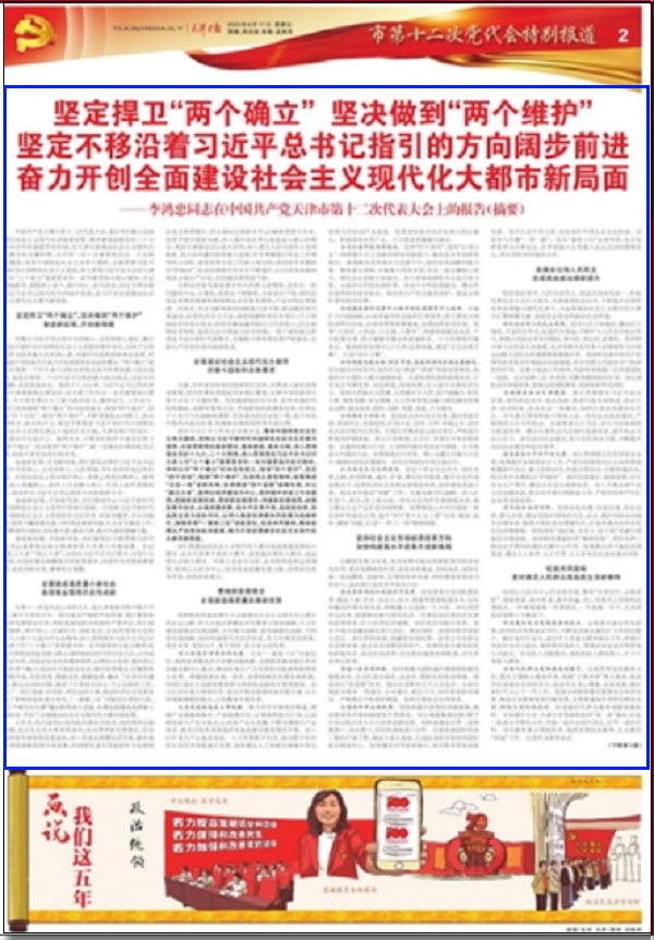 市第十一次党代会以来的五年,是天津发展历程中极不平凡、极为不易的五年。面对复杂严峻的外部环境、艰巨繁重的改革发展稳定任务,特别是新冠肺炎疫情的严重冲击,我们高举旗帜、维护核心、忠诚担当、创新竞进,全面贯彻落实党的十九大和十九届历次全会精神,深入贯彻落实习近平总书记对天津工作“三个着力”重要要求和一系列重要指示批示精神,坚定不移走高质量发展之路,以强烈的政治担当和历史主动,以功成不必在我、功成必定有我的精神境界,以明知山有虎、偏向虎山行的勇气魄力,坚决向不良政治生态、陈旧思想观念、巨额债务风险开战,攻坚克难、爬坡过坎、砥砺奋进,解决了许多历史遗留、群众关切的问题,推进了许多固本培元、守正创新的工作,办了一些打基础、补短板、利长远的大事,推动经济社会发展发生了影响深远的重大变化,“一基地三区”功能定位更加凸显,“五个现代化天津”建设取得重大成就,如期全面建成高质量小康社会,开启了全面建设社会主义现代化大都市新征程。