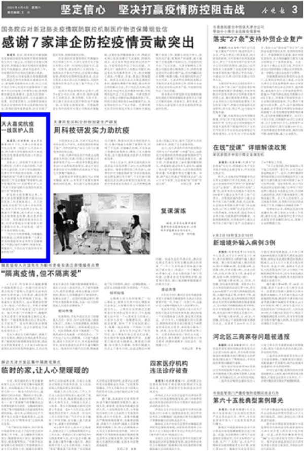 新冠肺炎疫情爆发以来,天津大学各附属医院累计派出110名医务工作者驰援湖北。在天津“战疫主战场”的天津大学海河医院,医护人员用生命捍卫生命,用健康守护健康,成为津沽大地上抗击疫情的急先锋、救治患者的主力军。各附属医院挺身而出支援,共同承担起全市新冠肺炎的主要救治任务,并肩筑成一道守护生命的钢铁长城。