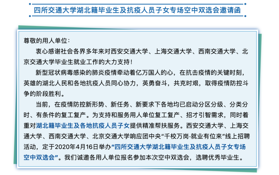 西安交通大学、上海交通大学、西南交通大学、北京交通大学定于4月16日举办“四所交通大学湖北籍毕业生及抗疫人员子女专场空中双选会”,着重对湖北籍毕业生及各地抗疫人员子女提供精准帮扶服务。