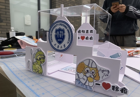 这个扫码神器外型是一个微缩版的天津大学卫津路校区东门,上面有建筑学院学生手绘的“万众一心,助力战疫”的宣传漫画,顶部是有机玻璃材料。使用时,志愿者把手机调试到扫码界面,放置在“东门”顶上,前来登记的同学把身份证头像向上放置在东门里,轻轻一点扫码登记完成。