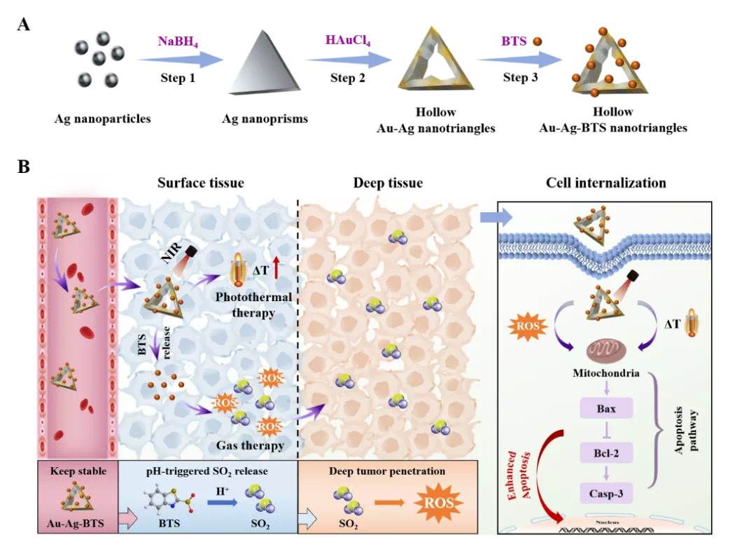 李楠课题组研发的新一代纳米抗癌机器人将金-银中空纳米三角和二氧化硫前药精巧地整合于一体,构建了一种有效的光热-气体联合肿瘤深部治疗纳米系统。该纳米抗癌机器人从三个方面进行了创新,有效提高了治疗的深度与精准度。