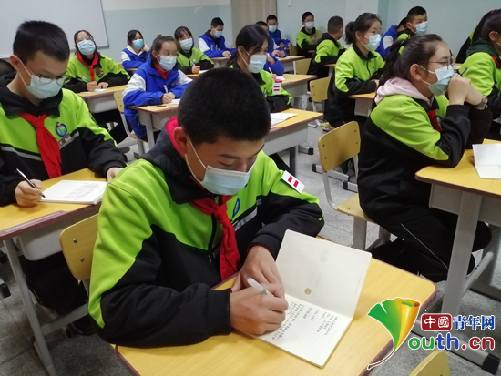 图为布尔津县初中入团积极分子们在课堂上认真做笔记。天津大学研支团 供图