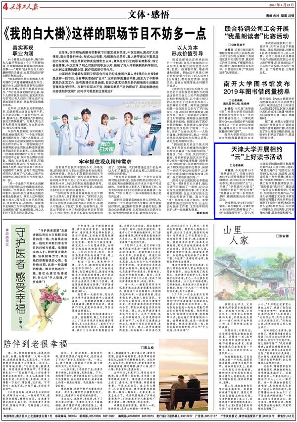 天津工人报讯(记者秦帆)今天是第25个“世界读书日”。天津大学自2016年以来持续推进书香校园建设,在2020年这个特殊的春天,师生们相约“云”上,开展了“学院读书大接力”“视频分享会”“听书打榜”“经典音乐会”等一系列形式多样、格调高雅的读书教育活动。