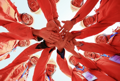 在京雄城际铁路工程五标段小型构件预制厂场地建设现场,工人们用击掌的方式相互鼓劲。新华社记者 王晓摄