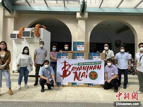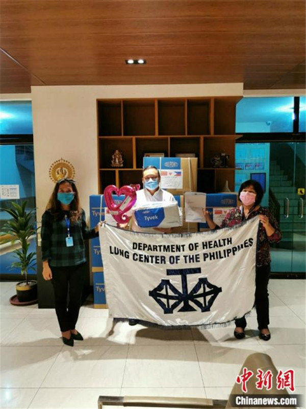 5月初,菲律宾华人刘启智(BensonLao)、施嘉驿(jackS.Gaisano)与港商温荣辉将联手从美国采购的第三批抗疫物资——6000件杜邦公司产特卫强500型医用防护服,捐赠给了菲律宾政府医院UP-菲律宾总医院、菲律宾肺部医院、东大道医疗中心,以及中华崇仁、崇基/光坦、崇仰三家华人医院,助力正在奋战的菲律宾医护人员。图为在菲律宾政府医院UP-菲律宾总医院的捐赠仪式。 中国驻菲使馆供图
