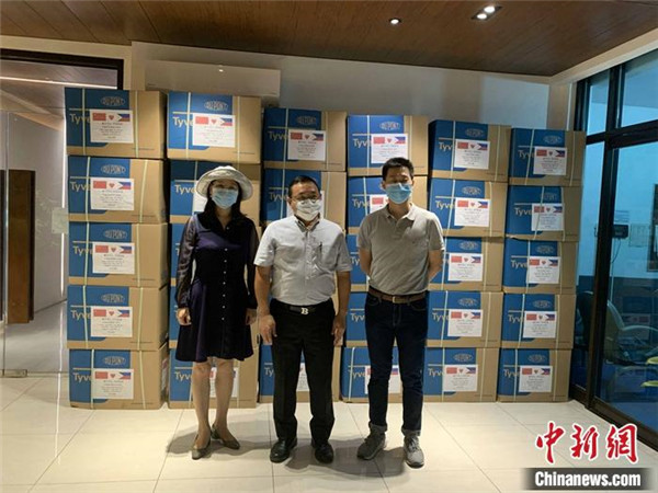 在中国驻菲使馆的协助下,菲律宾华人刘启智(BensonLao)、施嘉驿(jackS.Gaisano)与港商温荣辉完成了跨国跨洲抗“疫”的心愿。图为刘启智先生(中)代表三位捐赠者和中国驻菲使馆外交官们一同完成了捐赠工作。中国驻菲使馆供图