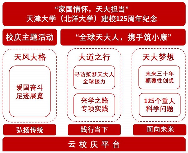 天津大学是中国第一所现代大学,其前身北洋大学成立于1895年。今年,学校将以“家国情怀 天大担当”为主题开展校庆纪念活动,重点打造一个主题活动,建设一个云校庆平台。
