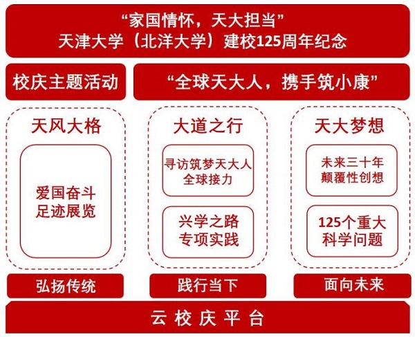 天津大学是中国第一所现代大学,其前身北洋大学成立于1895年。今年,学校将以“家国情怀天大担当”为主题开展校庆纪念活动,重点打造一个主题活动,建设一个云校庆平台。