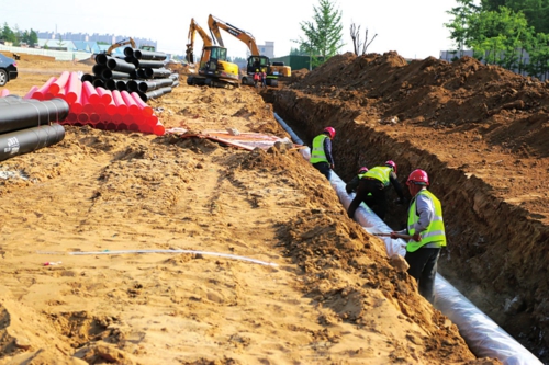 国内首条配备融合分布式光纤传感的输配水管线在山东省临沂市铺设,图为铺设现场。实康/供图