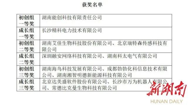 本届大赛总决赛按初创企业组和成长企业组各设一等奖1名、二等奖2名、三等奖3名和优秀奖3名。经激烈角逐,湖南能创科技有限责任公司获初创组一等奖,长沙精科电力技术有限公司获成长组一等奖。大赛组委会表示,对本次赛事获奖并落地湖南的项目,纳入省创新创业大赛支持范围。