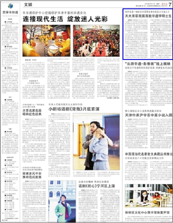 本报讯(记者高丽)记者从天津大学冯骥才文学艺术研究院获悉,去年秋天,国务院学位委员会批准天津大学设置全国首个非遗学科硕士学位授权点。冯研院作为培养我国首批非遗学科硕士生的试验田,自建院以来,始终把教学科研与我国文化遗产最前沿的工作紧密联系在一起,现已逐步形成独具特色的非遗教研方式。
