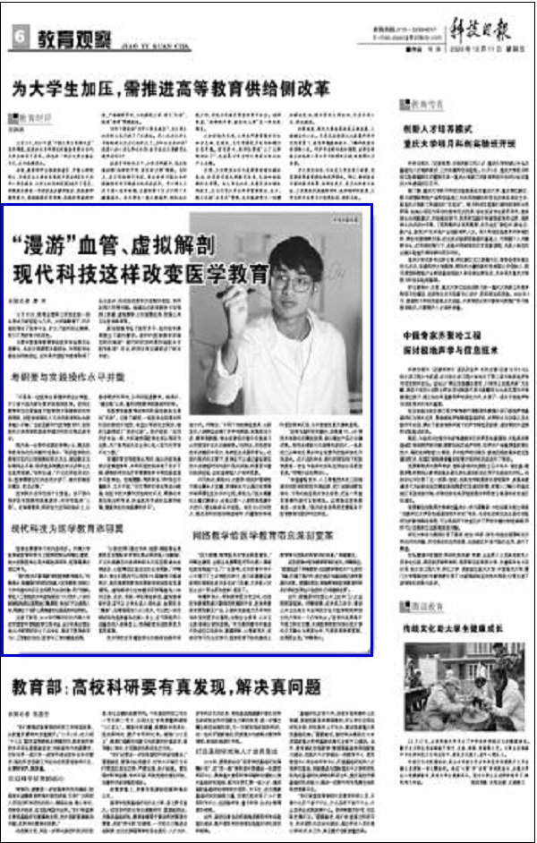 “以前老师们通过书本、挂图、模型等各类教具及实物标本向学生展示和讲授人体解剖,不足的是静态的教具和标本无法呈现诸如血液流动、心脏搏动这些动态的生命现象。”何峰表示,学生们现在可以利用VR眼镜学习解剖知识,其沉浸感使教学效果较传统挂图有显著增强。虚拟解剖台包含着逐层剥离虚拟人体的皮肤、肌肉、骨骼、神经等各系统;虚拟解剖软件甚至可以让学生进入消化道、血管里去“漫游”;而增强现实(AR)技术,可以把人体的解剖结构直接叠加在真人身上,还可将超声心动叠加在人体模型上,使得器官活动效果更为直观逼真。