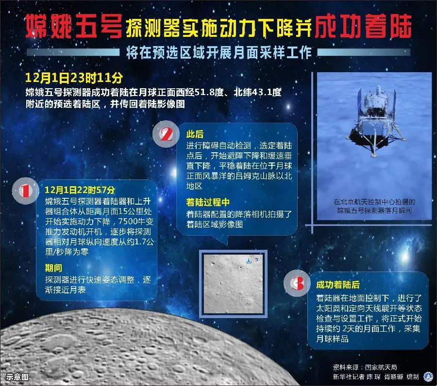 图表:嫦娥五号探测器实施动力下降并成功着陆 将在预选区域开展月面采样工作