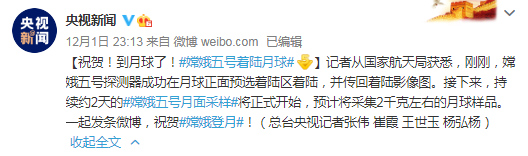 接下来,嫦娥五号正式开始持续约2天的月面采样工作,预计将采集2千克左右的月球样品。