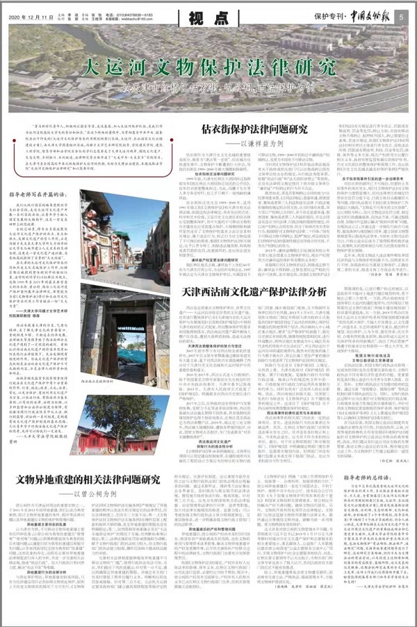 习近平总书记高度重视大运河文化的保护传承利用工作,多次做出重要批示指示。不久前,为贯彻落实《大运河文化保护传承利用规划纲要》《长城、大运河、长征国家文化公园建设方案》,国家发改委联合国家文物局、水利部、生态环境部、文化和旅游部,分别编制了4个专项规划,指导沿线省(市)编制了8个地方实施规划。但令人痛心的是,天津市红桥区大运河文化遗产作为大运河周边文化遗产的重要组成部分却已遭受重大破坏。天津大学法学院的青年学子聚焦其中涉及的文物保护重点难点问题,包括文物保护“有法难依、执法难严、违法难究”问题、文物异地重建问题等进行了研究。这些研究言虽稚嫩,但仍不失为文博法治的有益尝试,以及促进上述纲要和规划落实的有益探索。篇幅所限,这次发表的仅是概要,近期会把研究成果的全文在网上发布。这项工作我们还将持续开展下去,盼望能得到各有关部门和专家学者的关注和支持!