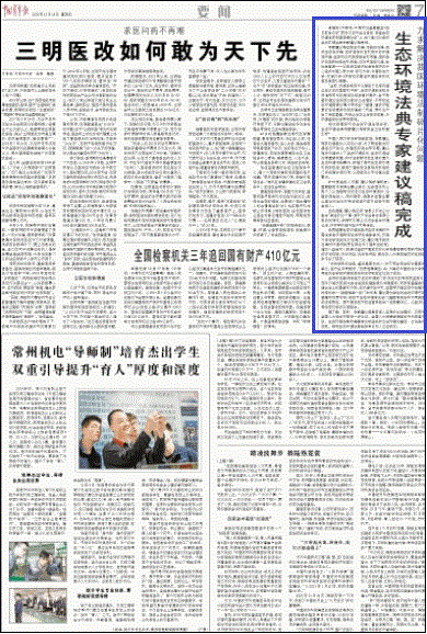 据了解,目前,专家建议稿是否进入实质的立法程序,正等待全国人大有关方面进一步论证。全国人大常委会原副秘书长李连宁说,生态环境法典的编纂有比较坚实的立法和理论基础,立法条件成熟,期待生态环境法典能够早日列入立法规划。
