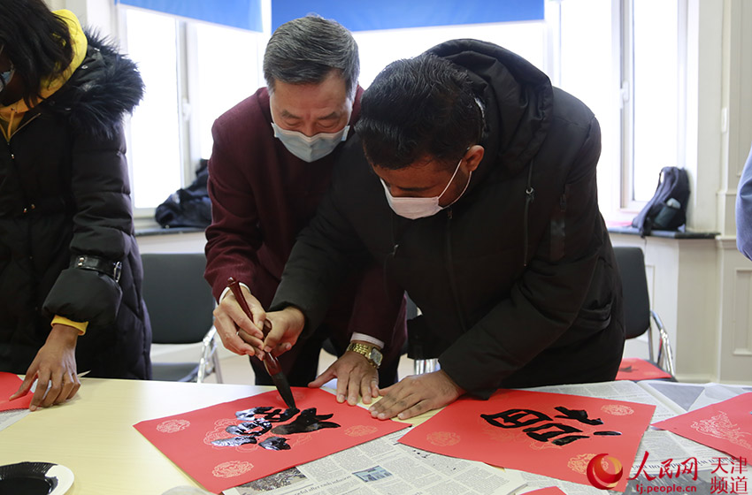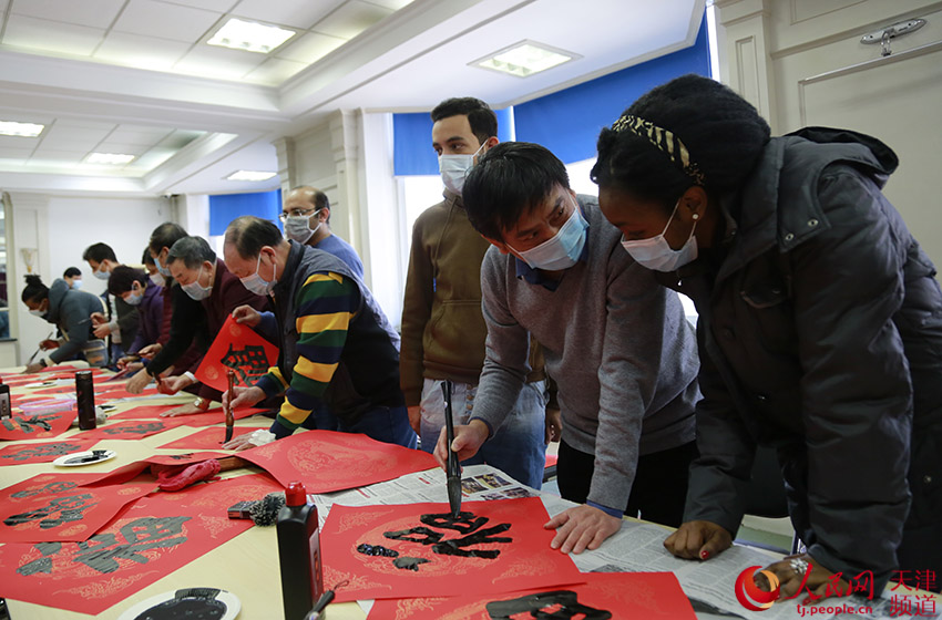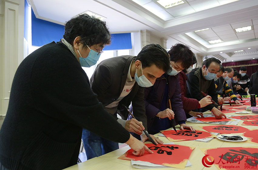 在文化学者的讲解下,留学生写福字。人民网 崔新耀摄