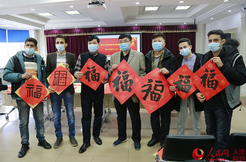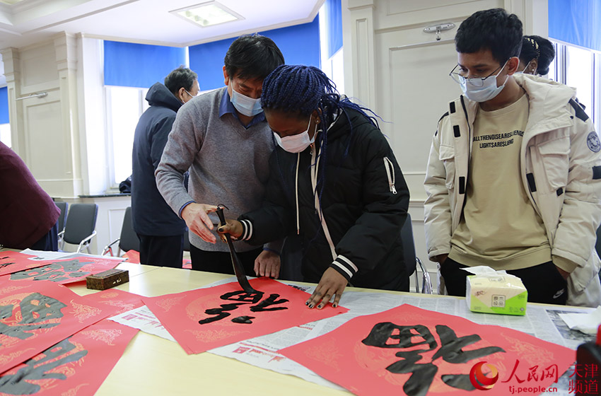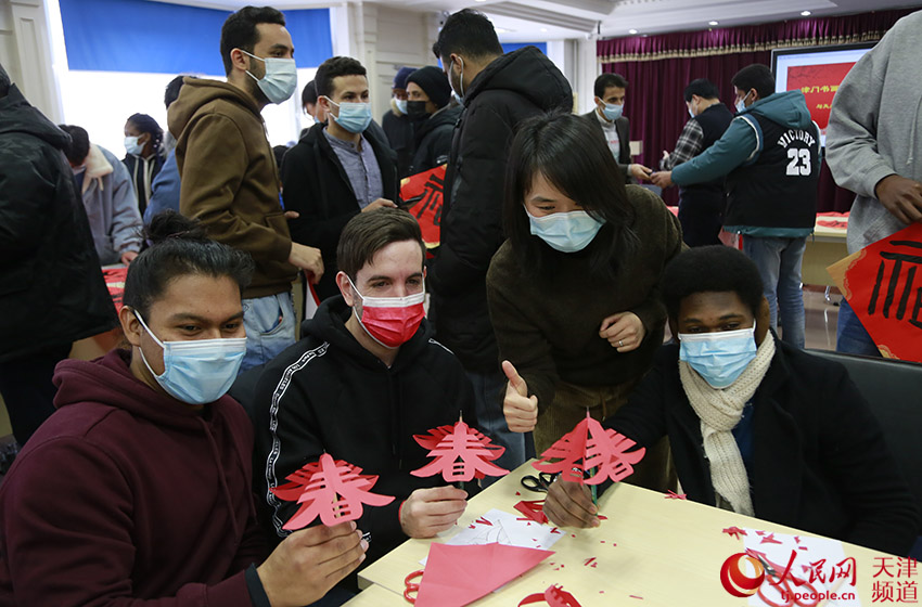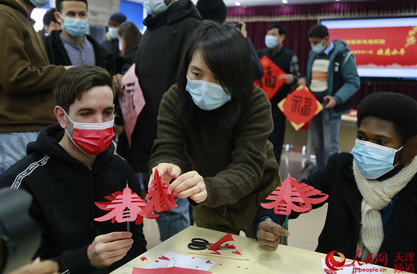 人民网天津2月5日电 (崔新耀)精美的中国结福字,金光灿灿“新春快乐”的卷轴、喜气洋洋的红灯笼……2月4日是中国农历中的“小年”。这一天,天津大学19个国家的留学生代表欢聚一堂,在文化学者的讲解指导下学习春节习俗,一起写对联、剪窗花,其乐融融体验中国传统文化。