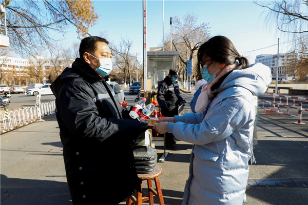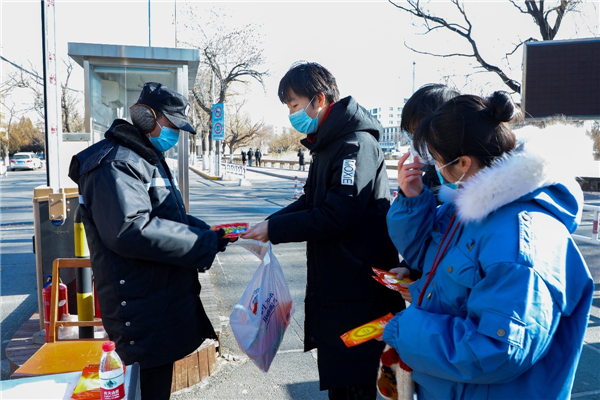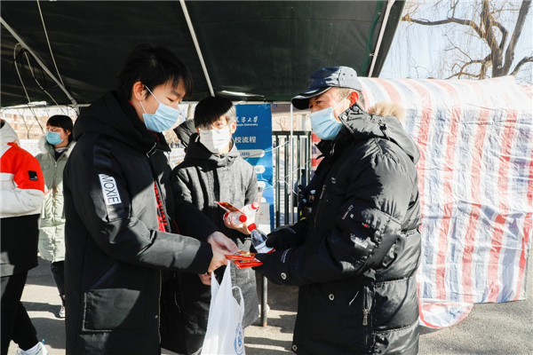 除了保卫处员工,天津大学还有教师3000余人次参与了校门志愿值守。举着二维码冻红的双手最需要的是暖手热水!寒风中不停跺脚的身子最需要暖贴!天津大学的学生们贴心地为值守者们送来了热水与暖贴。他们说:“谢谢为我们守门的小哥哥和老师们,冻哭地图也不能冻哭你!”
