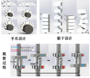 此外,课题组还提出了一种新型气动管道爬行机器人,可应用于工业管道设施的检查和实时监控。该管道爬行机器人采用仿生尺蠖原理,通过巧妙布置薄膜气缸单元之间的连接,实现机器人在管道内、外壁面爬行。柔性驱动方式的应用使该机器人能够适应大范围管道直径的变化,并可应对直管、弯管、竖管、水平管以及各种角度倾斜管应用场景,同时机器人可承受自重80倍以上负载。