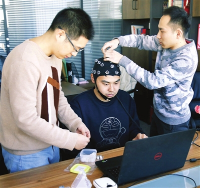 “医疗领域是脑机接口的主要用武之地之一。这套‘脑御’智能脑控康复训练系统,基于世界机器人大赛夺冠所采用的先进智能算法,采集运动想象微弱脑电信号,通过芯片进行深度学习,对脑电信号进行分析,目的是提取出人大脑的运动意图,识别出大脑意图后,再驱动手上贴的辅助外部装置──电刺激模块实现患者手部主动运动。通过这样的训练,可以让脑卒中患者恢复肢体运动能力。”高忠科介绍说,其实验室自主研发的脑机接口采集设备,能提供非常高精度的便携式的信号采集,脑卒中患者训练时可通过主动想象,激活运动神经,重建其受损的神经通路,以实现运动功能的康复。