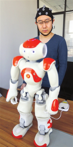 “区别于运动想象,我们研究采用的脑机接口的运动范式,是基于稳态视觉诱发电位刺激。”参与该项研究的硕士研究生李坤告诉记者,戴上AR眼镜后,可见屏幕上有多个指令,每个指令按照不同的固定频率闪烁,当注视某一个指令时,大脑中就会产生相应的脑电信号,经过深度学习算法的分析,最终控制机器人的行动轨迹。