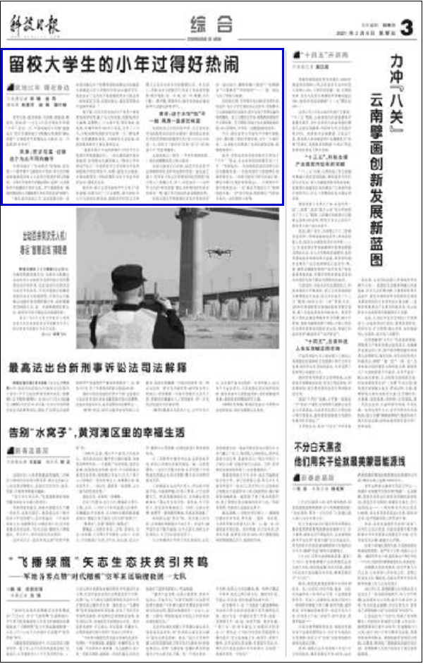 据介绍,南开大学为留校学生开展了“新岁余闲,诗影与归”三行诗创作、奋斗2021等几个方面的比拼活动,鼓励同学们用文字和图片记录并分享丰富的假期生活。在生活上,学校为春节留校学生发放了美食暖胃餐券(除夕晚餐,初一中、晚,初二中、晚餐,共计5餐)。除夕夜,学校领导、辅导员等也会通过各种方式慰问留校学生。