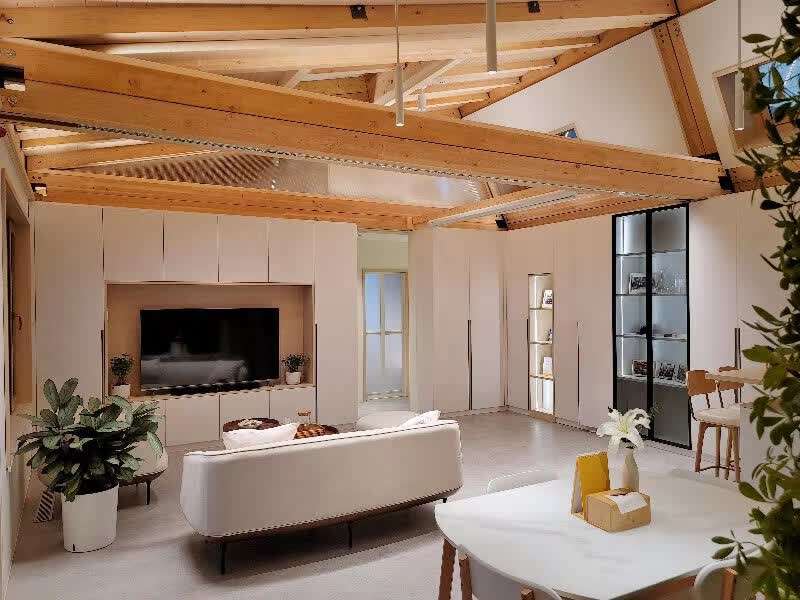 它看上去就像一座绿植环绕、造型独特的小木屋。屋顶一反常态,由两块大小不一、角度不同的顶板拼接弯折而成。进入建筑内部,简洁的智能化家居让空间感更足;“三室两卫”各有特色化的功能设计足以满足全家所需。