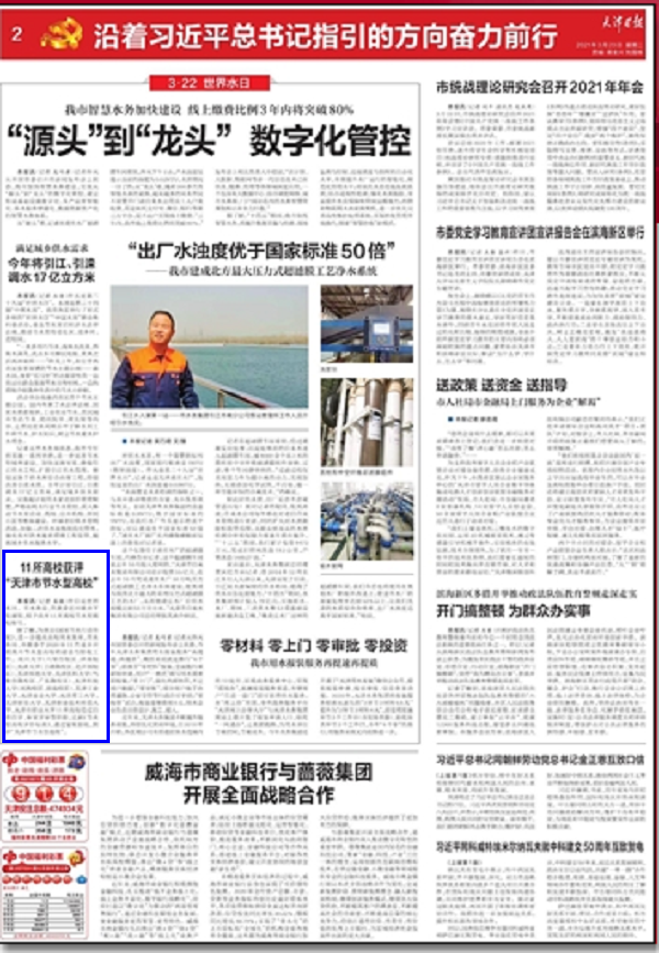 据了解,为落实《国家节水行动方案》,进一步提高高校用水效率,市水务局、市教委于2020年11月逐步开展我市节水型高校的建设与验收工作。南开大学(八里台校区、津南校区)、天津大学(卫津路校区、北洋园校区)、天津师范大学、天津医科大学(气象台路校区、广东路校区)、天津科技大学(河西校区、滨海校区)、天津工业大学、天津商业大学、天津理工大学、天津财经大学、天津职业技术师范大学、天津市职业大学11所高校经过自查自评、专家评审等阶段,达到《节水型高校评价标准》,通过复核验收,获评“天津市节水型高校”。