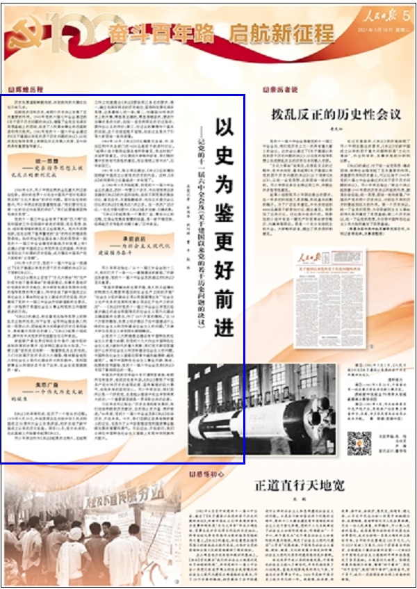 习近平总书记指出:“历史总是向前发展的,我们总结和吸取历史教训,目的是以史为鉴、更好前进。”40年前,党的十一届六中全会及其《决议》总结历史、开启未来。今天,我们回顾这段具有转折意义的过往,也是为了从中汲取推动党和国家事业继续发展的智慧和勇气。不忘过去、开拓前行,我们必将在中国特色社会主义道路上实现中华民族伟大复兴。