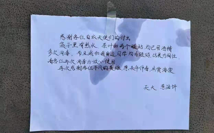 “感谢各位白衣天使们的付出,袋子里有热水茶叶,还有两个暖贴,均已用酒精多次消毒,请再次消毒后放心使用。再次感谢各位平凡的英雄,愿来年仲春共赏海棠!”这两天,一张署名“葱油饼”的暖心字条让天大师生津津乐道。