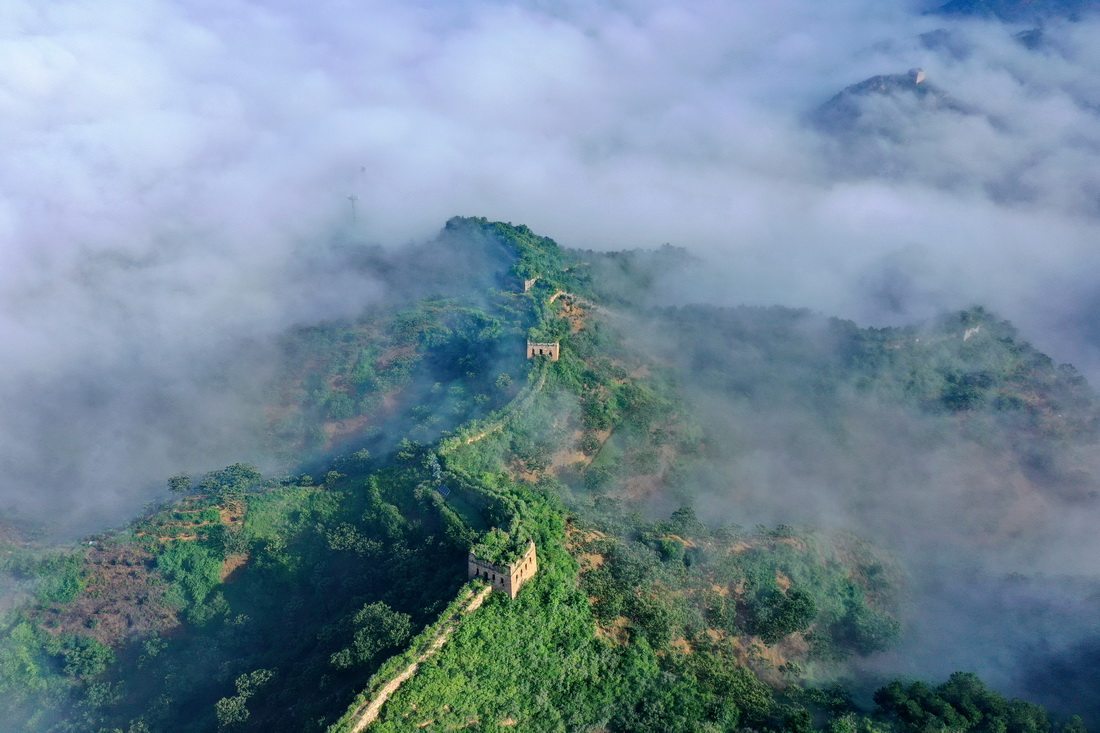 这是2020年8月25日拍摄的河北省迁西县榆木岭长城云海景观(无人机照片)。新华社记者 牟宇 摄