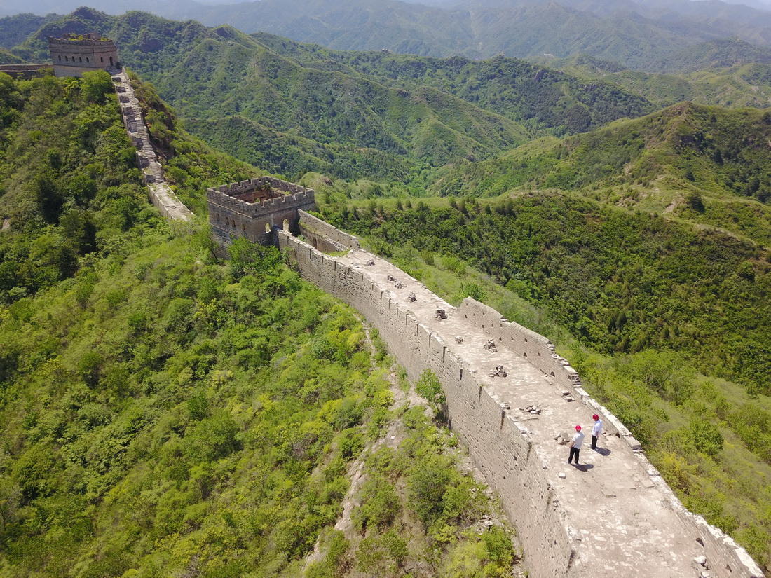 6月11日,在金山岭长城,技术人员在采集长城破损情况信息(无人机照片)。新华社发(王立群 摄)