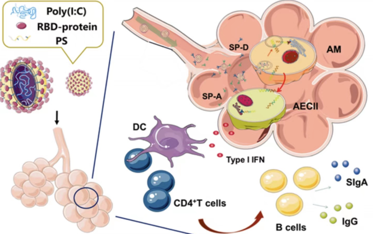 新冠病毒主要通过呼吸道传播。呼吸道黏膜是防止呼吸道病毒入侵的第一道屏障,激活黏膜免疫以保护机体免受病毒感染至关重要。天津大学研发团队通过构建仿病毒纳米颗粒,开发了一种新型纳米喷雾技术,这种仿病毒颗粒包含的“衣壳”由可高效结合肺巨噬细胞的表面活性脂质体组成,解决了常规呼吸道接种时疫苗难以进入机体的缺陷。仿病毒颗粒的“核心”为免疫佐剂,“刺突”蛋白为RBD(受体结合区),这一结构完全模拟了新冠病毒的尺寸、结构和感染方式,可更加高效地激活机体的呼吸道黏膜免疫,以获得更好的抗新冠病毒感染效果。