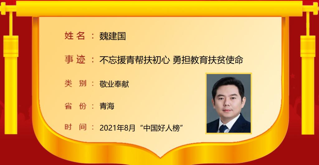 人物故事: 按照中央部署,为做好对口援青工作,天津大学响应党中央号召,选派精兵强将赴青海开展教育扶贫工作。作为选派干部中的杰出代表,魏建国讲政治、顾大局,舍小家、为大家,接过对口援青的“接力棒”,在艰苦环境中锤炼党性、磨炼意志、砥砺品行、担当作为,在新岗位上用习近平新时代中国特色社会主义思想武装头脑、指导实践、推动工作,为助力教育扶贫、推进新青海建设贡献了智慧和汗水。