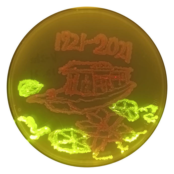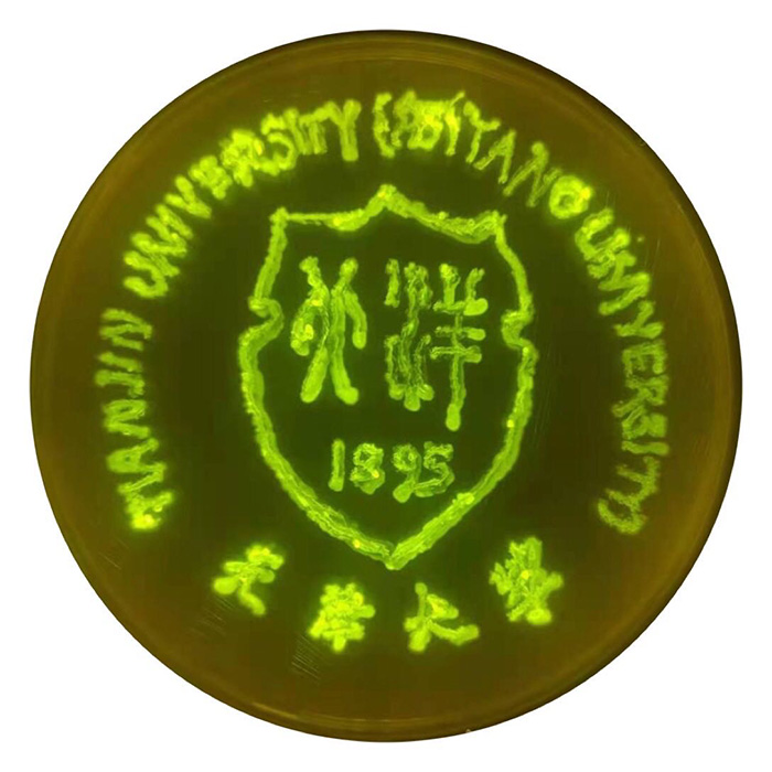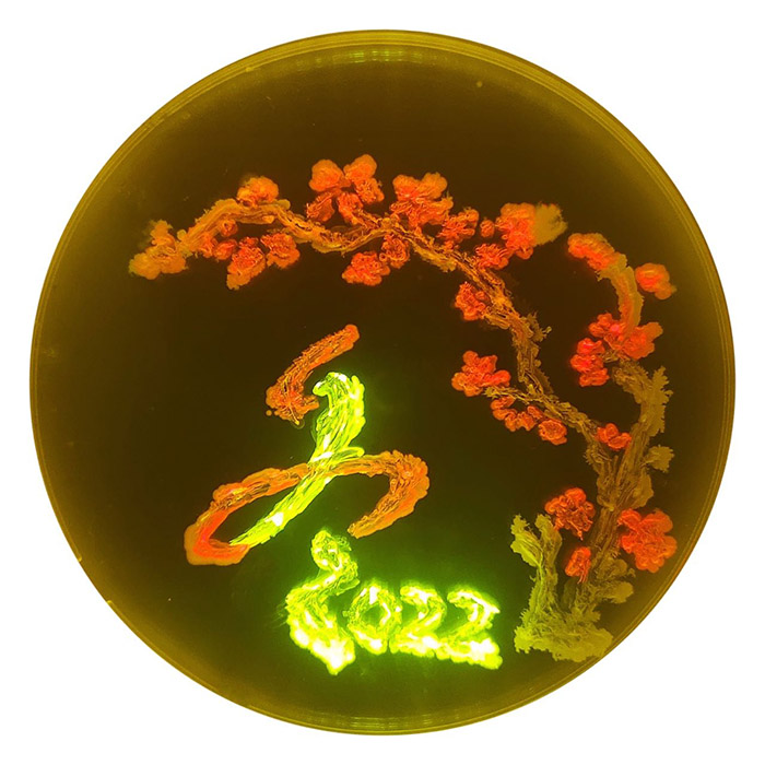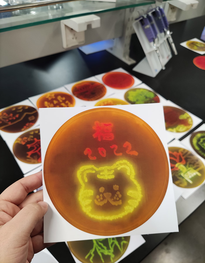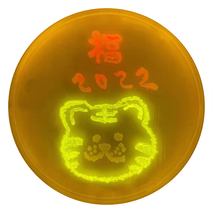 人民网天津12月28日电 “秦小熊带着她的小熊朋友和她的培养基给大家拜个早年。”近日,天津大学化工学院2019级生物工程二班的学生秦雨珂在自己的朋友圈晒了一张由萌萌的小老虎和2022字样组成的图案。这个图案是她用导入了红色荧光蛋白和绿色荧光蛋白的大肠杆菌在培养基中完成的,而“微生物绘画”正是她本学期“微生物学实验课”期末考试的内容之一。
