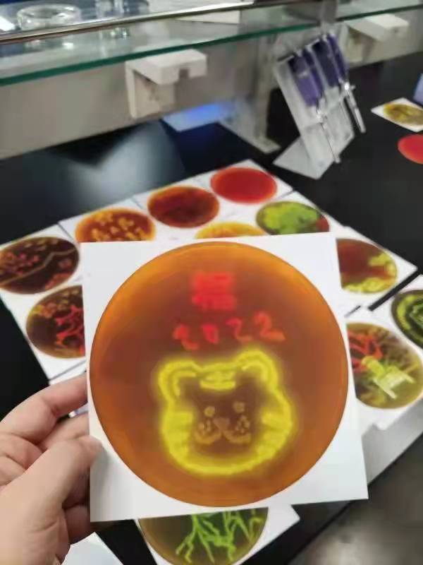 “秦小熊带着她的小熊朋友和她的培养基给大家拜个早年。”12月24日,天津大学化工学院2019级生物工程(2)班的学生秦雨珂在自己的朋友圈晒了一张由萌萌的小老虎和2022字样组成的图案。这个图案是她用导入了红色荧光蛋白和绿色荧光蛋白的大肠杆菌在培养基中完成的,而“微生物绘画”正是她本学期“微生物学实验课”期末考试的内容之一。