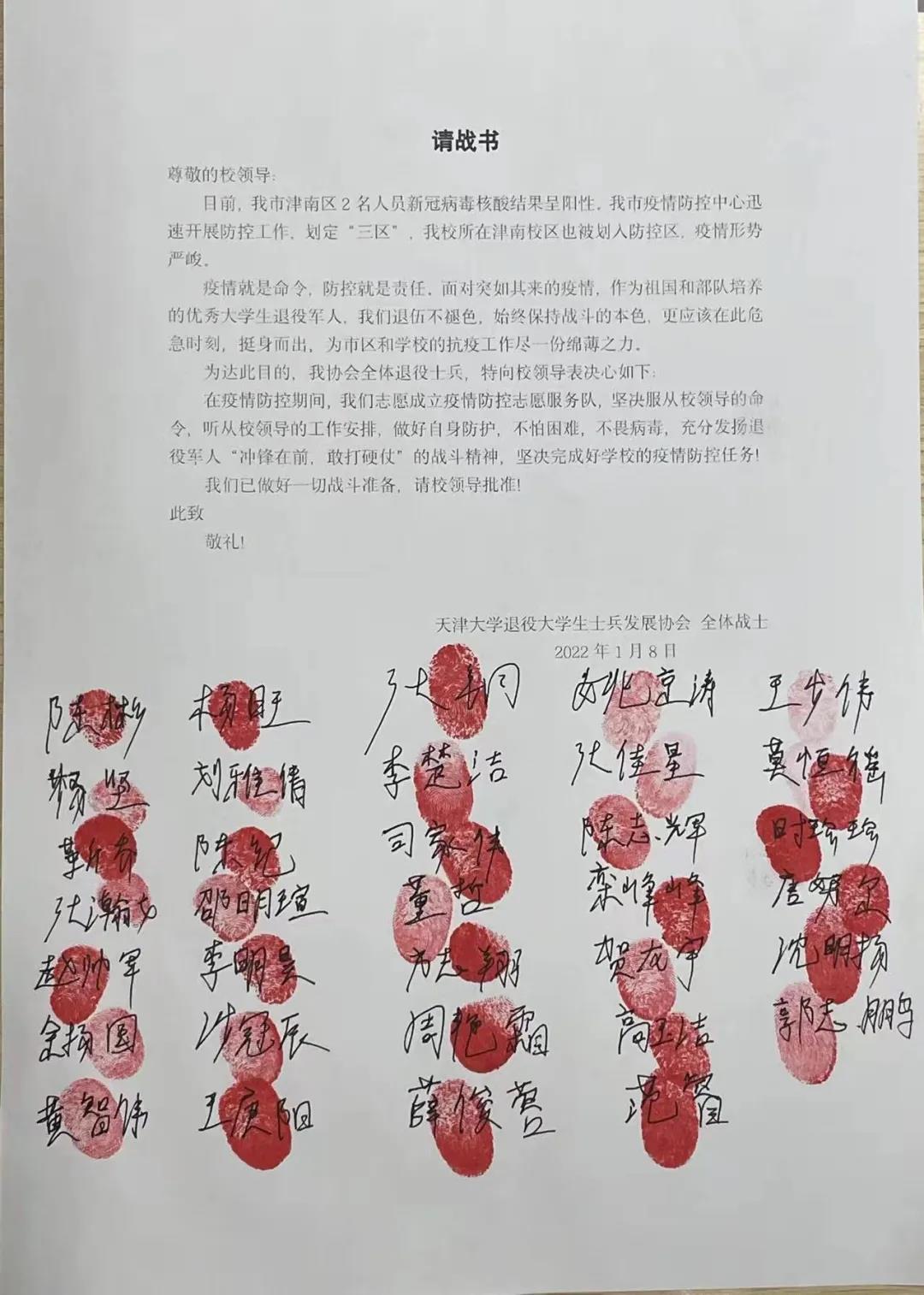 “疫情就是命令,防控就是责任。特表决心如下:我们志愿成立疫情防控服务队,不怕困难,不畏病毒,已做好一切战斗准备,请校领导批准!”铿锵有力的宣言、33个鲜红的手印……这两天,一份别开生面的“请战书”在天津大学师生中迅速流传。