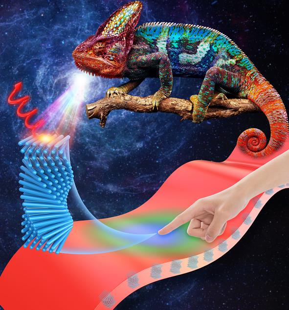 天津大学封伟教授团队受自然界变色龙智能变色机制启发,将动态共价硼酸酯键引入主链型胆甾相液晶弹性体中,同时利用热激发动态B-O键交换特性,实现了变色薄膜的任意颜色和三维形状可控编程,并且其形状和颜色能够通过改变温度实现可逆调控,成功研发新型智能材料——“智能变色液晶高分子薄膜”。这种新材料厚度只有200微米,兼具力致变色、形状可编程和优异的室温自修复能力:在被拉伸时可以发生颜色变化;被切断后在断口处加几滴水,一段时间后材料就能重新愈合,从而具有更长的使用寿命。该材料还拥有“记忆编程”特性,可以被拉伸成任意二维或三维形状并保持不变,当材料加热到相变温度以上后,又能恢复到最初的形状。