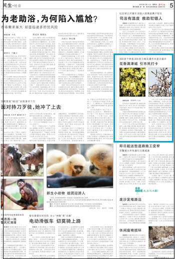 市城市管理委园林绿化管理处处长王和祥介绍,本市建成区共种植了300多个种类、300多万株花灌乔木,目前蜡梅、樱花、连翘、迎春花等已经绽放,花期在7天至10天左右。其他花灌乔木也将逐次盛开,花期可至立夏。