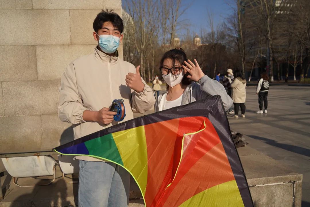 在北洋园校区大通学生中心、卫津路校区体育场前广场等地都设置了醒目的“风筝领取处”,学生只要带上自己的学生卡就能领取风筝,用后归还即可;对于“0经验”的新手,校团委邀请了“天津风筝魏”的老师们提供线上教学服务,还专门安排了“老玩家”在场地内对学生们提供现场指导。