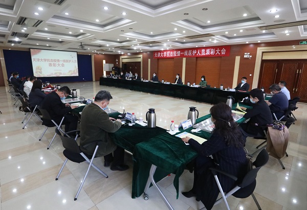 表彰会上,学校授予天津大学天津医院、天津大学海河医院、天津大学儿童医院、天津大学环湖医院、天津大学中西医结合医院、天津大学胸科医院“天津大学新冠肺炎疫情防控工作先进集体”荣誉称号;授予附属医院110名援鄂医护人员“天津大学新冠肺炎疫情防控最美逆行者”荣誉称号。
