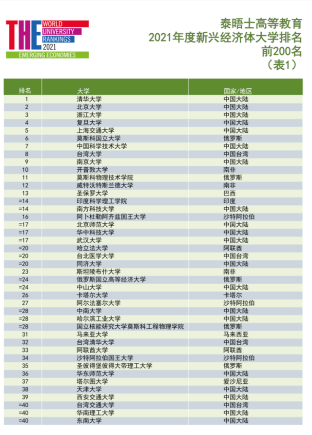 根据排名,排在世界新兴经济体大学前十的学校分别是:清华大学、北京大学、浙江大学、复旦大学、上海交通大学、莫斯科国立大学、中国科学技术大学、台湾大学、南京大学、开普敦大学。在前20名中,中国大陆首次有12所高校入榜,南方科技大学上升了16个位次至第14名,北京师范大学(第17名)和同济大学(第20名)也进入前20名榜单。