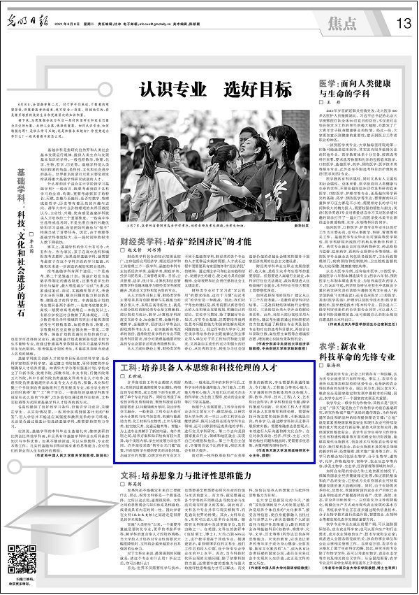 许多高校的工科专业都按大类招生,类别的设置通常按照专业属性,将相近的专业聚类,成立类别下的专业群,打破了单个专业的边界。同时也考虑了本校的学科优势和特色,聚焦科技前沿和国家需求,以问题领域为导向,突出学科交叉融合。一般来说,工科专业大致可分为计算机与电气信息类、机械与能源动力类、化工材料与生物类、土木与环境类、航空航天类、交通运输类等。智能+为上述专业类赋予了新的内涵。每个类别之间,培养方案和知识结构有较大差异,每个类别内部,学生的发展方向也不同。许多高校采取“转专业无门槛”政策,目的是给学生提供更优的成长环境,启迪学生的智慧,点燃学生的专业学习热情。一般来说,四年的本科学习后,工科学生将具备通用能力、专门能力、工程能力等核心能力,为他们以后成为杰出的科学家、杰出的工程师、成功的企业家等打下坚实基础。